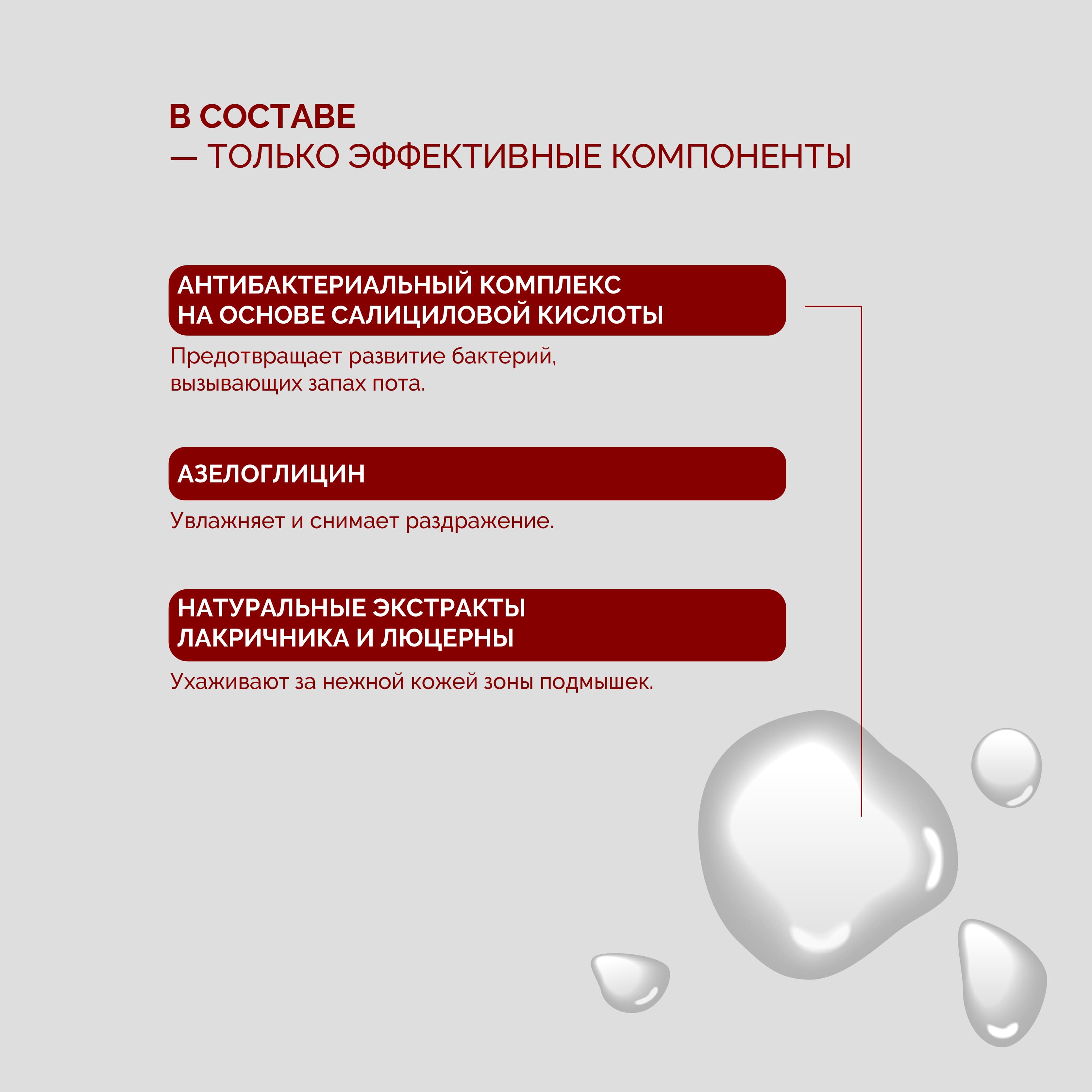 Формула сочетает в себе высокоэффективные ингредиенты с ухаживающими компонентами, чтобы обеспечить максимальную защиту от запаха и пота без ощущения сухости или раздражения.