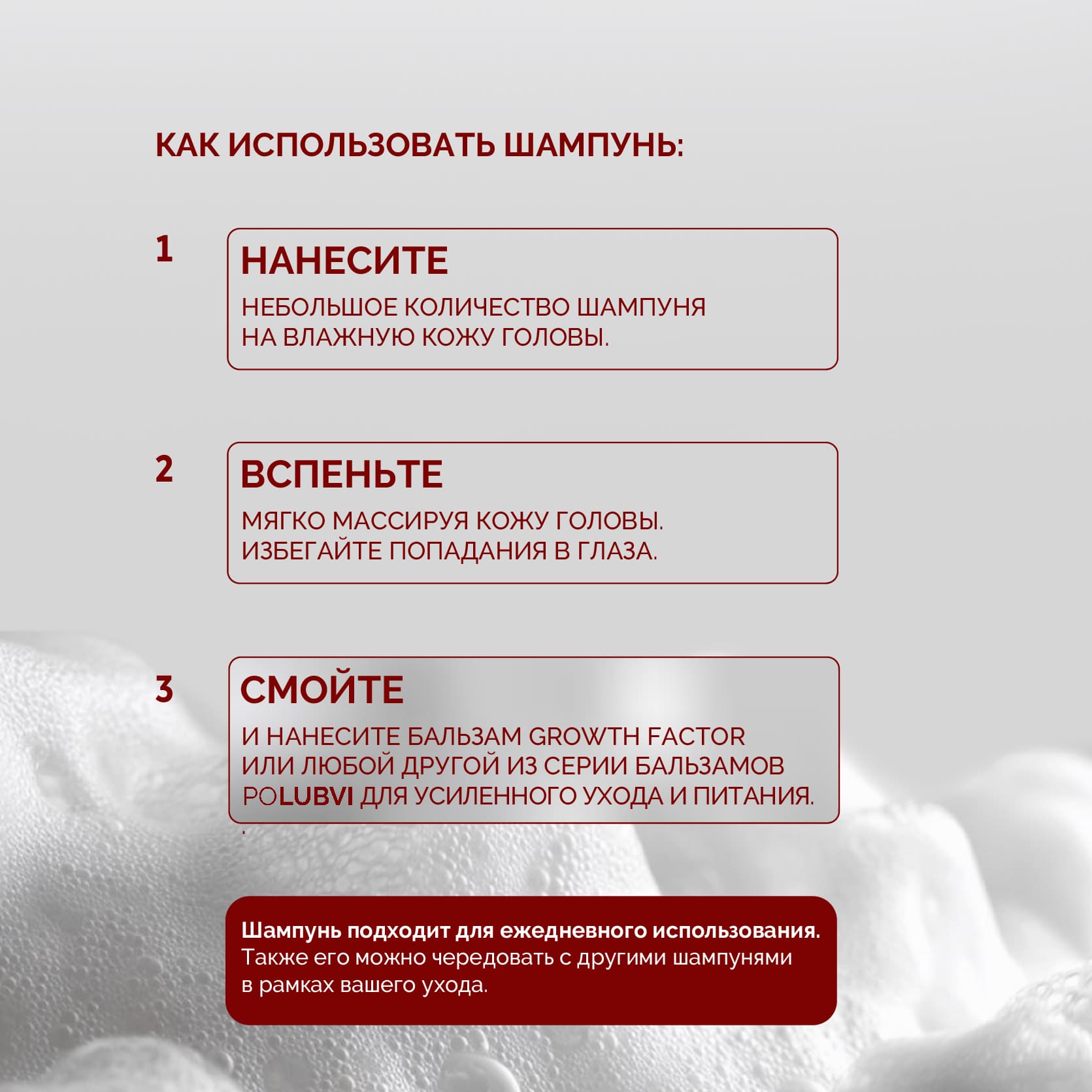 Шампунь GROWTH FACTOR создан специально для тех, кто мечтает о густых, сильных и блестящих волосах. Здоровые волосы — это результат правильного ухода и качественных средств.