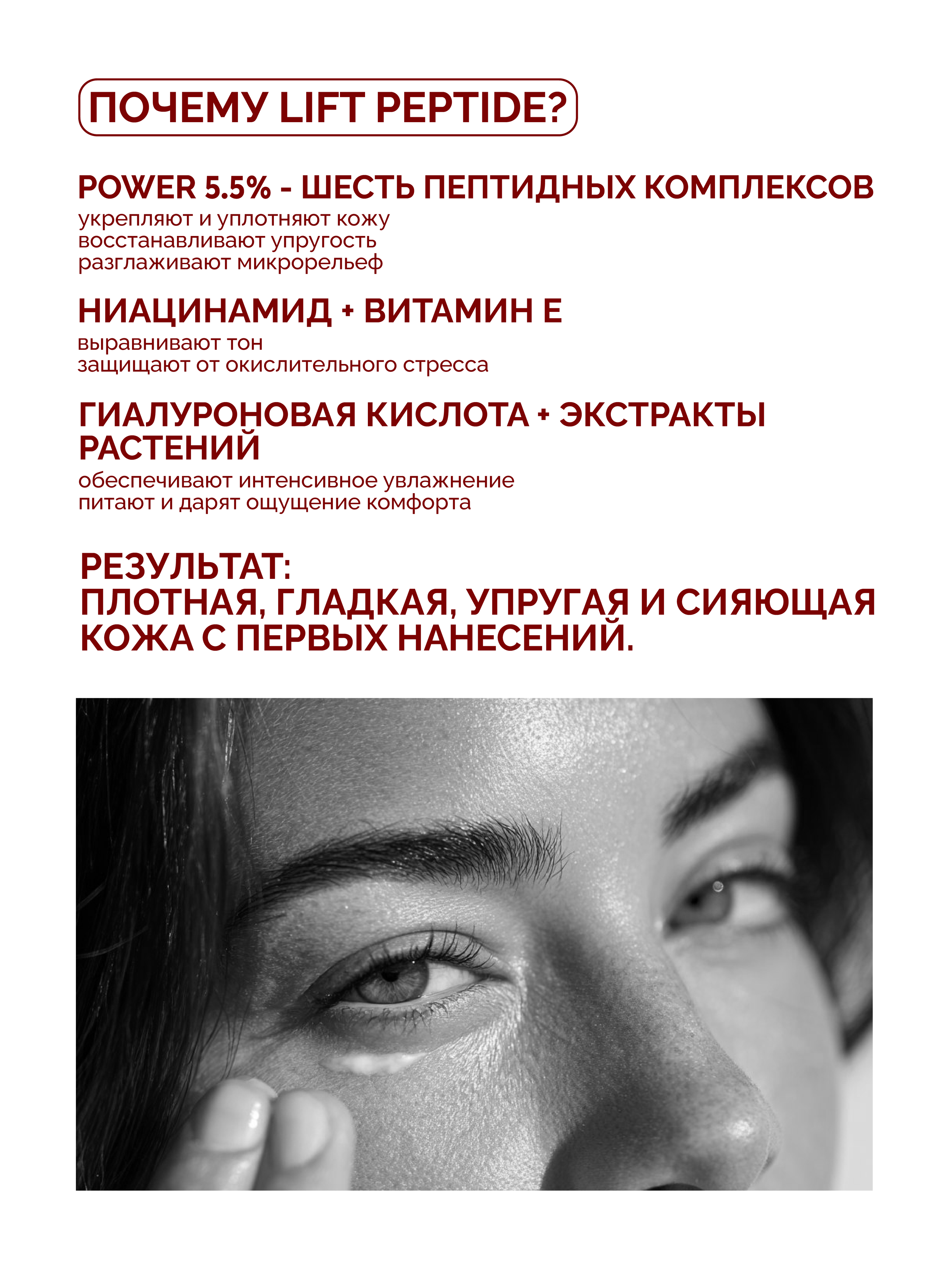 LIFT PEPTIDE сочетает мощные активные пептиды нового поколения, антиоксиданты и витамины, чтобы: